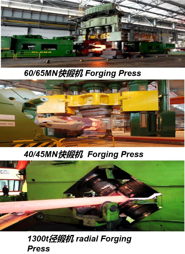 为满足模块、大型锻件产品性能的特殊要求,在后道热处理工序配置14 座退火/正火炉,6座淬/回火(固溶)炉,4座淬火介质槽,可处理工件为20-30t 。锻造后步机加工工序有锯床、立式带锯、龙门铣床、刨床、无芯剥皮机床及各类车床总数达50 余台。